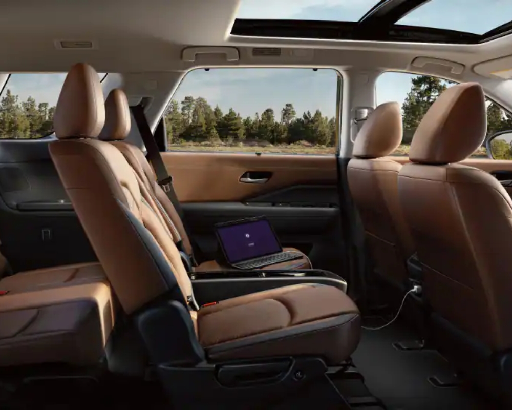 Inside, the Pathfinder offers seating for up to eight passengers, with available second-row captain’s chairs for added comfort. The cabin is designed with premium materials, and the Platinum trim features semi-aniline leather-appointed seats with quilting, providing a touch of luxury. Technological advancements include a standard 8-inch infotainment touchscreen, with a larger 9-inch display available on higher trims. Apple CarPlay® and Android Auto™ integration come standard, with wireless connectivity offered on the SL and Platinum trims. An available 12.3-inch digital instrument cluster and head-up display keep drivers informed without distraction.